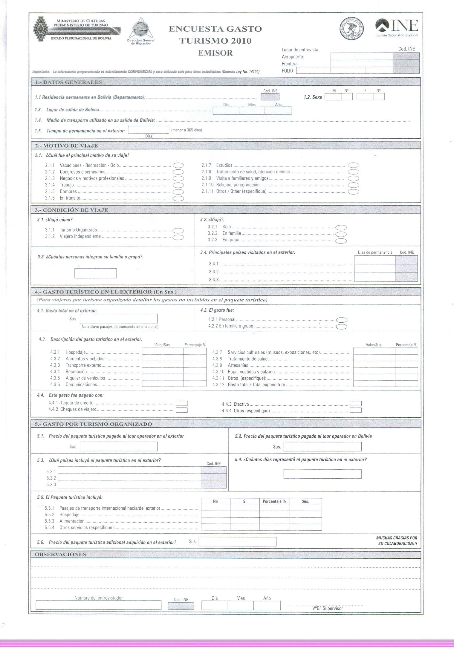 En este sentido, el Viceministerio de Turismo, el Banco Central de Bolivia (BCB), el Instituto Nacional de Estadística (INE) y la Dirección General de Migración, en procura de satisfacer la necesidad prioritaria que tiene el sector de turismo por contar con información actualizada para Balanza de Pagos, Cuentas Nacionales y fundamentalmente para la toma de decisiones del sector, consideran por conveniente realizar las “Encuestas Gasto del Turismo Receptor y Emisor”, en temporada alta y baja - 2010.